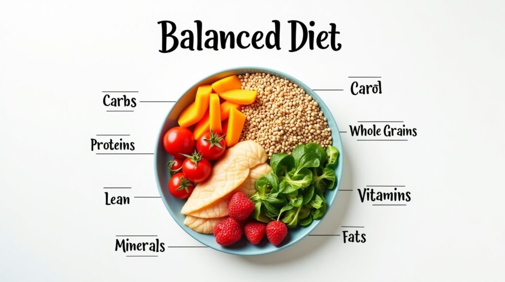modern flat-lay design with the heading ‘Balanced Diet’ written at the top in bold aesthetic font. In the center, a perfectly arranged balanced diet plate showing colorful fruits, fresh vegetables, whole grains, lean protein, and healthy fats. Surrounding the center food plate, small labels appear like ‘Carbs’, ‘Proteins’, ‘Fats’, ‘Vitamins’, and ‘Minerals’. Soft natural lighting, white background, high-quality sharp details, Pinterest-style healthy lifestyle layout tools to