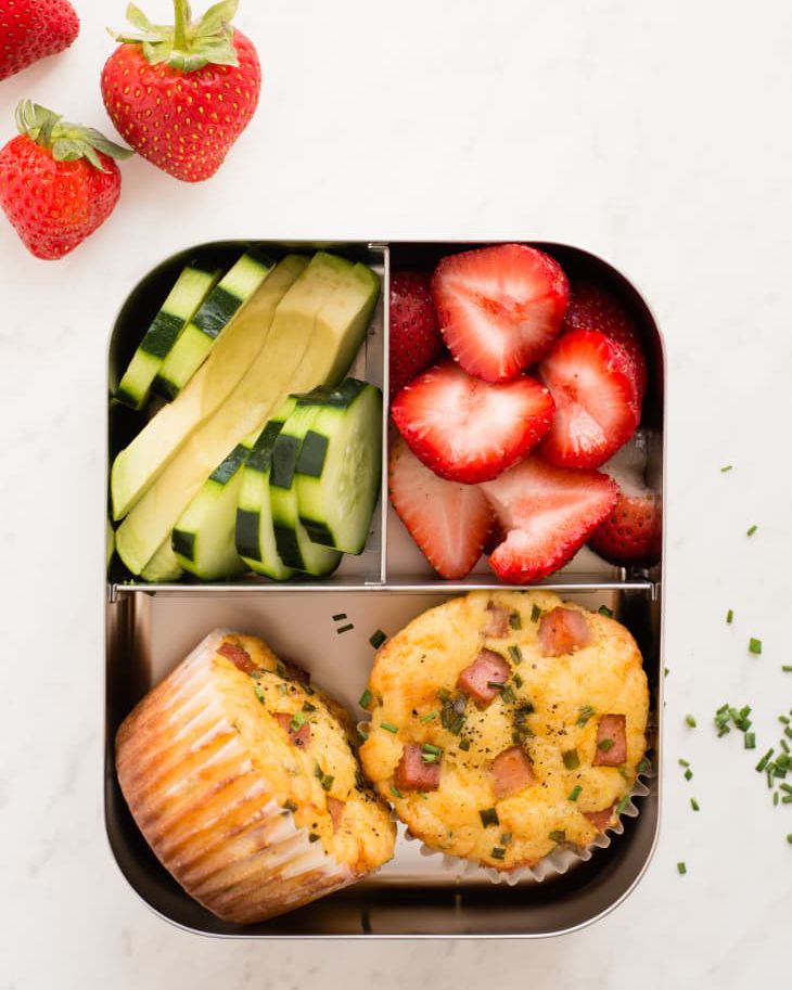 Fill each section of a lunch container with small snacks — mini muffins, veggie sticks, boiled eggs, and apple slices. It’s colorful and keeps lunch interesting.