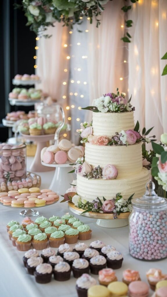 A wedding dessert table is usually softer, romantic, and elegant. Think of pastel colors, floral arrangements, candles, and gold accents. The wedding dessert table can feature cupcakes, macarons, cake pops, and a beautiful centerpiece cake.