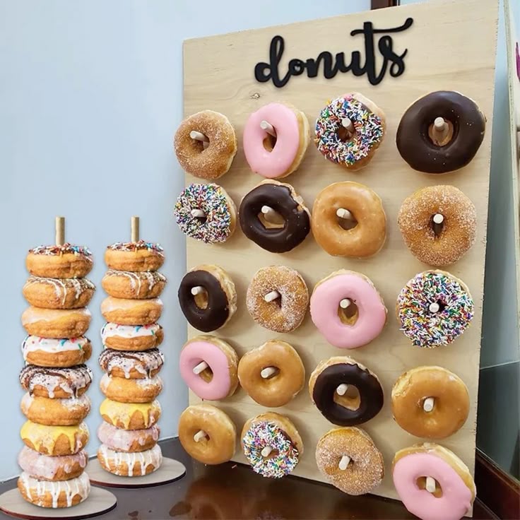 Donuts on a pegboard or tiered stand are trendy and eye-catching. A donuts display instantly adds color and fun energy to your dessert table.