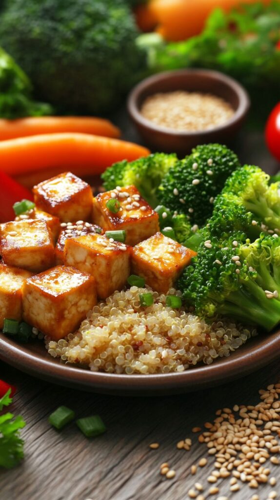 Combine tofu, quinoa, and colorful veggies with tahini dressing for a nutrient-packed bowl.