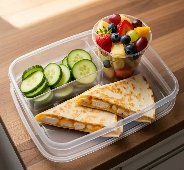 Pack a small pot of hummus with carrot sticks, cucumber slices, and pita bread strips. Add grapes or strawberries for a touch of sweetness.