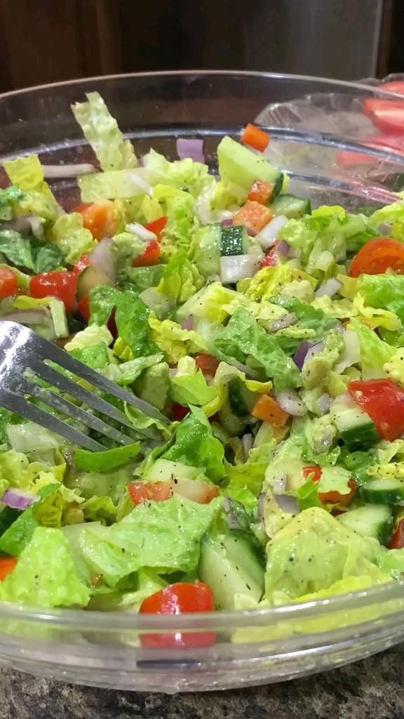 Lettuce, beans, salsa, beef or chicken, corn, and a sprinkle of cheese. All the taco flavor, but lighter.