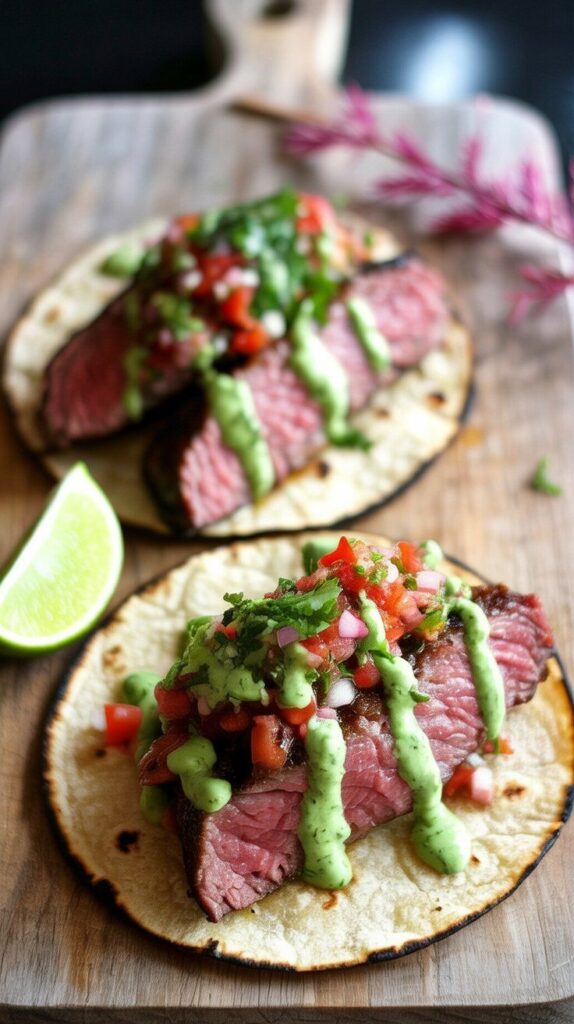 Who says tacos are just for Tuesdays? These steak dinner ideas bring a fun twist to your weeknight. Use grilled flank steak, sliced thin, and top with pico de gallo, avocado, and lime crema.
